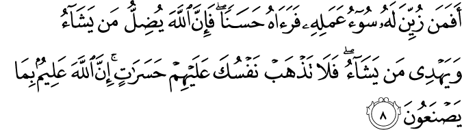 What of him whose evil deed was made attractive to him, and so he regards it as good? Allah leads astray whomever He wills, and He guides whomever He wills. Therefore, do not waste yourself sorrowing over them. Allah knows exactly what they do.